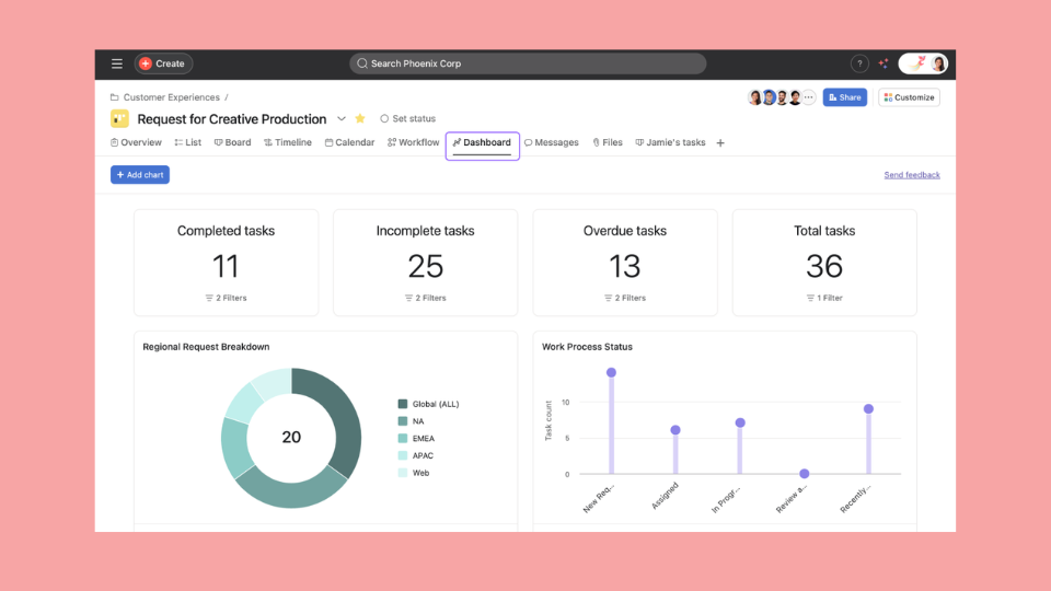Start with the questions you need answered. If it’s “are we on track?” add a completion over time chart. If it’s “who’s overloaded?” add tasks by assignee. If it’s “what type of work dominates?” add a custom field breakdown. Most dashboards work well with 3-5 focused widgets rather than trying to show everything.