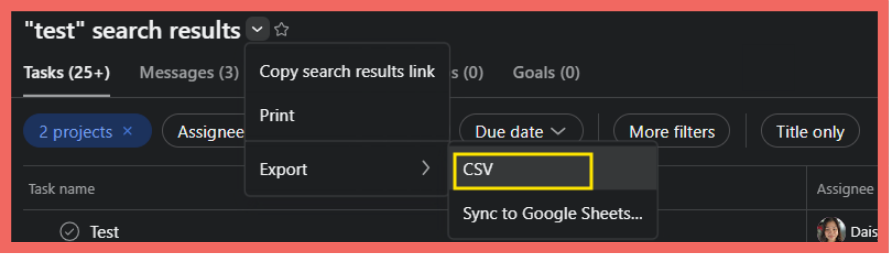 - Set your search criteria (projects, assignees, dates, etc.)