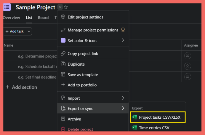 In the dropdown menu, look for “Export or sync” near the bottom. Click it, then select “Project tasks CSV/XLSX.”