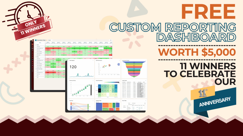 We’re gifting 11 winners one month each of fractional data team services (worth $5,000) to celebrate NSquared’s 11th anniversary. Get a custom reporting dashboard free to build and free to use for 30 days.