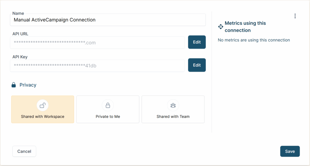 Select the Privacy level for the connection (you can edit this later, too): Shared with Workspace, Private to Me, or Shared with Team.
