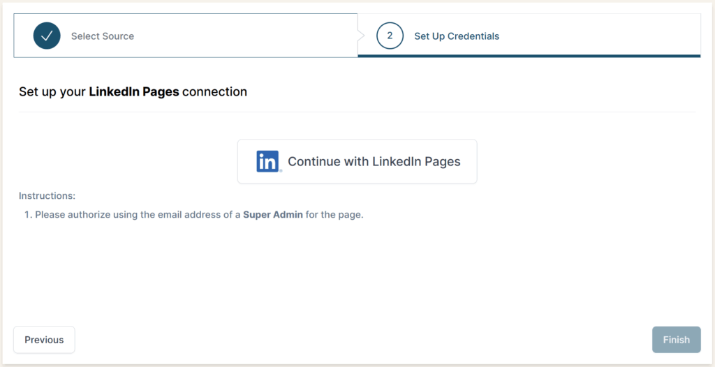 From the Connection Stepper interface, select LinkedIn Pages in the Select Source tab. In the Set Up Credentials tab, click the Continue with LinkedIn Pages button.