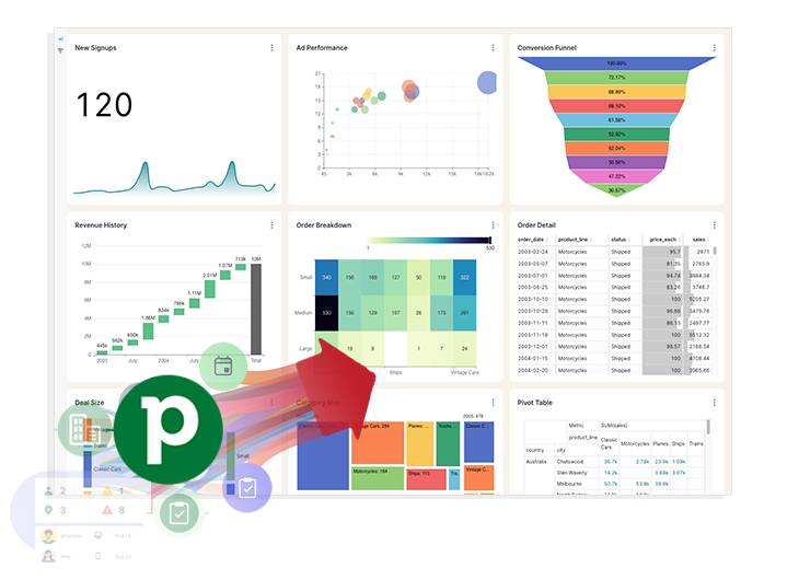 - Multi-Source. Pull your Pipedrive account data plus intel from other systems (marketing, project management, finance, time tracking) into unified dashboards for new clarity.